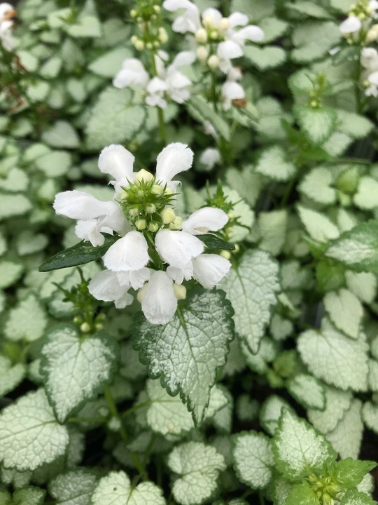 Lamium (dovenetel) - rechts op de foto, grijs blad met groen randje