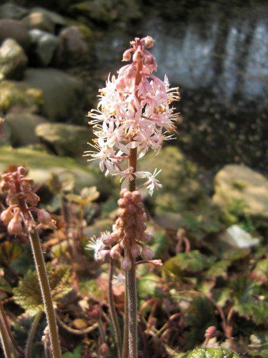Heuchera (purperklokje) veel soorten met verschillende bladtinten - linksonder op de foto, groen met paarse bladnerven